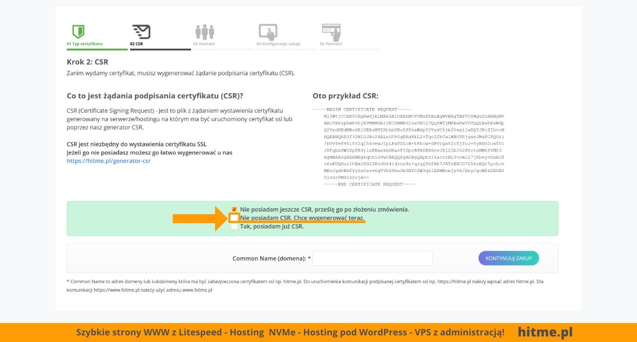 Zaznacz [x] Nie posiadam CSR. Chcę wygenerować teraz i uzupełnij [1] swoje dane